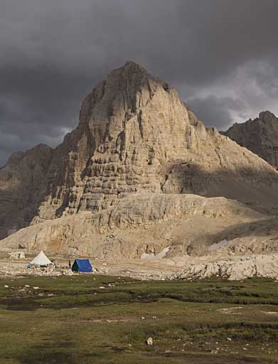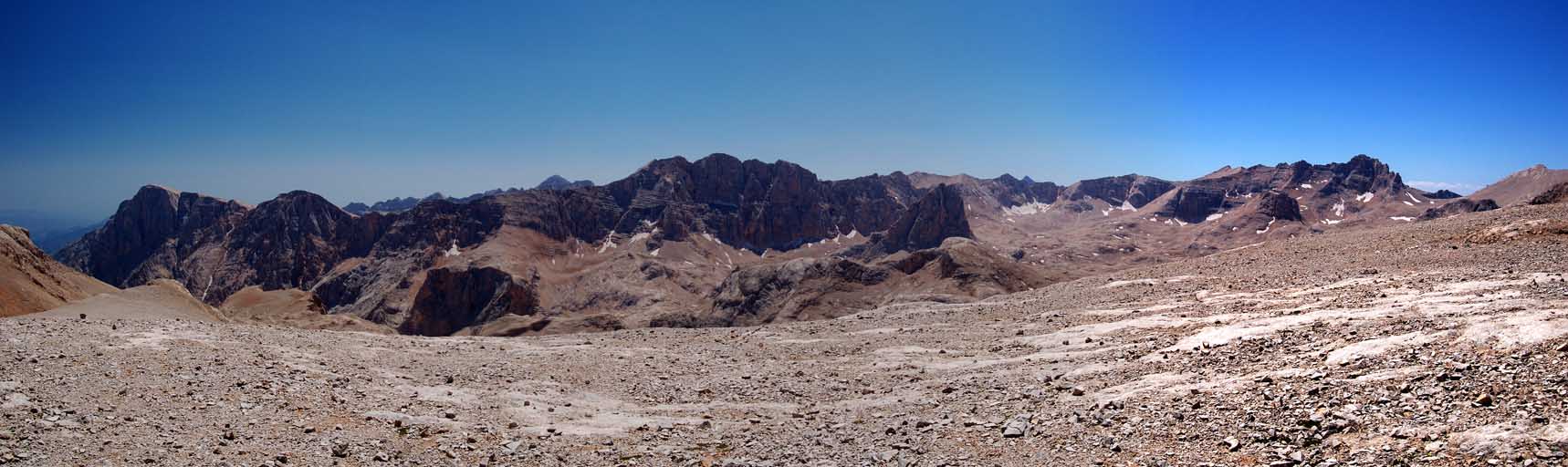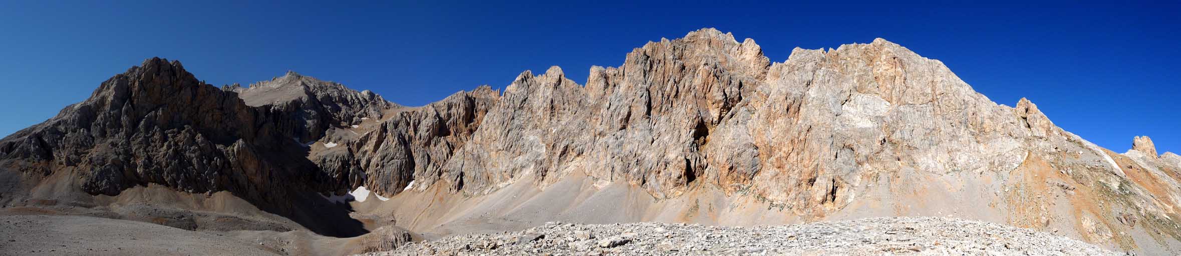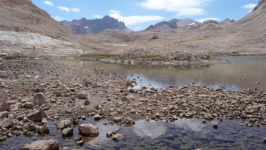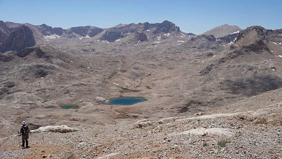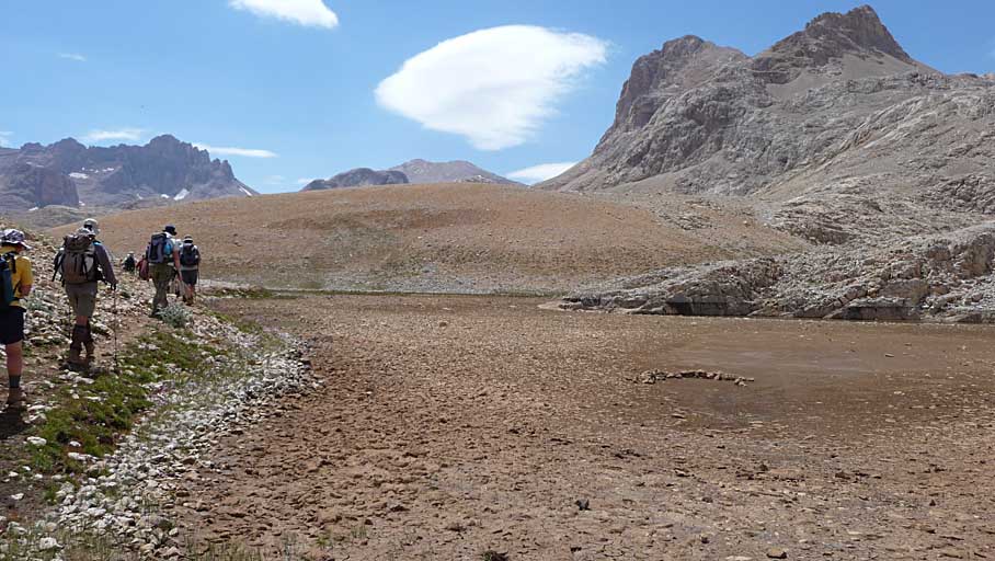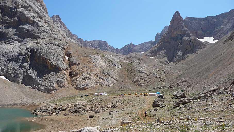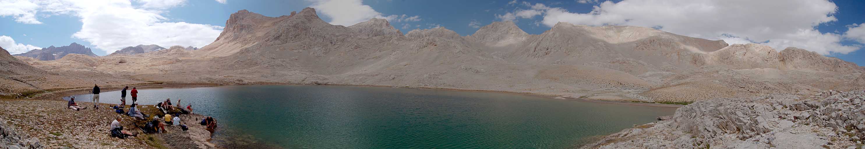 We continued our trek past this stunning panorama of the Demirkazik massif to and through the Akcay valley and on towards the Tekkekalesi Pass photo. There was a spectacular panorama from the top of the pass. A hole drilled through the cliff photo as we looked back and a view of the lakes of Yedi Goller ahead photo. The descent was quite steep photo but we had this panorama from the bottom as we continued to the Yedi Goller (Seven Lakes) basin. We passed by one lake photo 1 and photo 2 to our lunch spot by the lake. Eventually we reached our camp with the spectacular Direktas behind. That night, with beautifully clear skies we were able to watch shooting stars from the Perseid meteor shower.