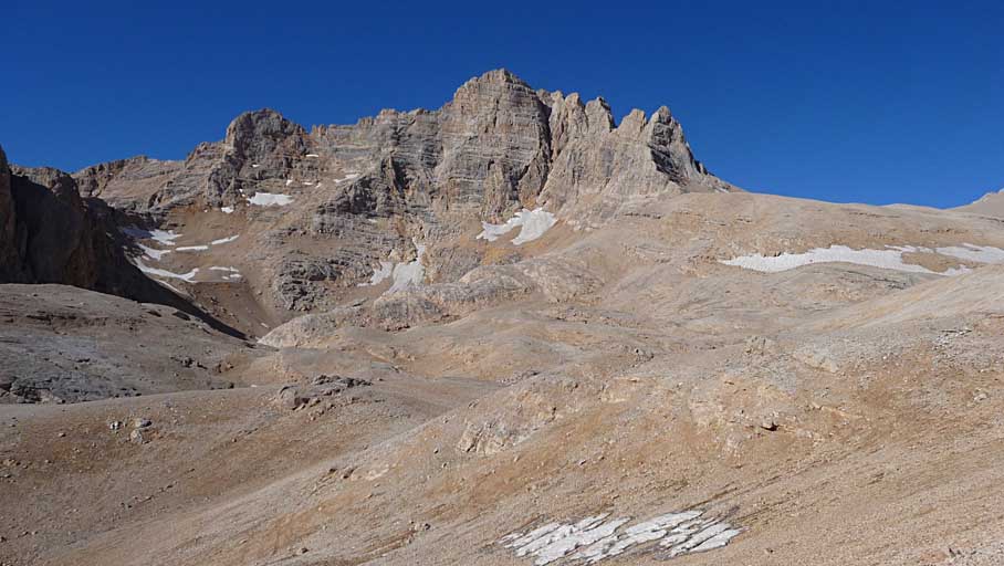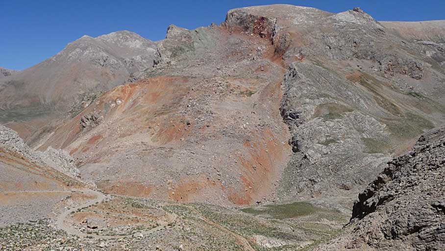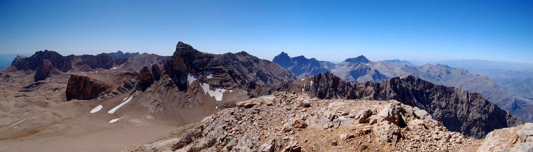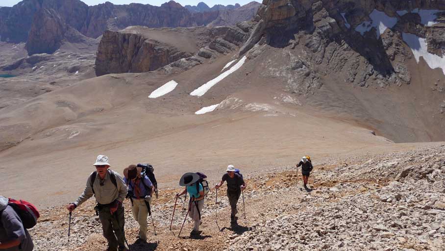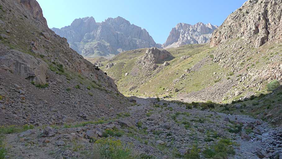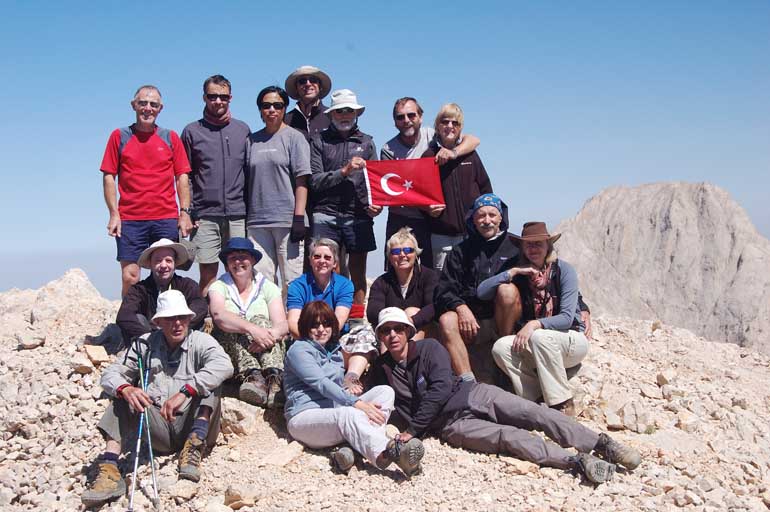 Today we headed for the peak of Mount Embler (3723 m), the second-highest peak in the region after Mount Demirkazik. Firstly we walked up the pass on the right in this photo. The summit of the pass is seen below us photo as we make the final push to the summit. From the top there's a marvellous panorama to the north, here showing the sharp peak of Mount Demirkazik nearby. As usual on such occasions we posed for a summit group photo. We stayed for a while on the summit, as it was warm, before we headed back down to the col and continued down the Celikbuyduran Pass and the Yalak Deresi trail. It was steep and narrow in places image 1,